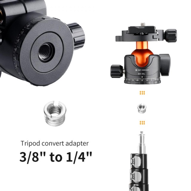 • * Amplia compatibilidad: la rótula de la serie K&F Concept KF-35 utiliza un tornillo de 3/8" para conectar trípodes, mientras que el tornillo de 1/4" sirve para cámaras, soportes para teléfonos móviles, videocámaras y anillos de luz. Es compatible con las cámaras sin espejo con objetivos zoom y las cámaras réflex digitales del mercado.