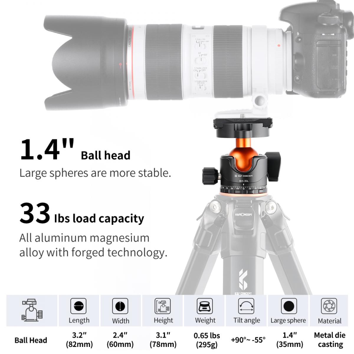 • K&F Concept Professional 35mm Metal Tripod Ball Head 15kg/33lbs Load 360 Degree Rotating Panoramic