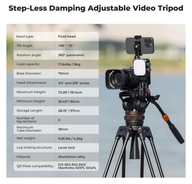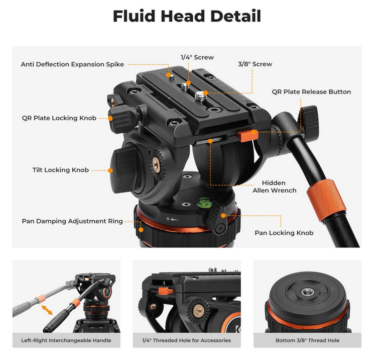 El cabezal de trípode profesional K&F VA3+BV10 garantiza un movimiento fluido y estable de la cámara gracias a su avanzado sistema de amortiguación hidráulica y a su control preciso, lo que lo hace ideal para la grabación de vídeo y la composición precisa.