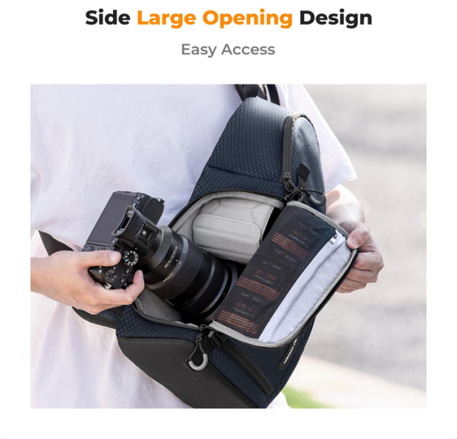 La bolsa para cámara K&F Urban Wander 02 10L (azul) es una bolsa de pecho resistente y versátil con espacio suficiente para el equipo fotográfico, los accesorios y los objetos personales. Está diseñada pensando en la seguridad y la comodidad, y es ideal para los amantes de las cámaras réflex digitales, las cámaras réflex y las cámaras sin espejo.