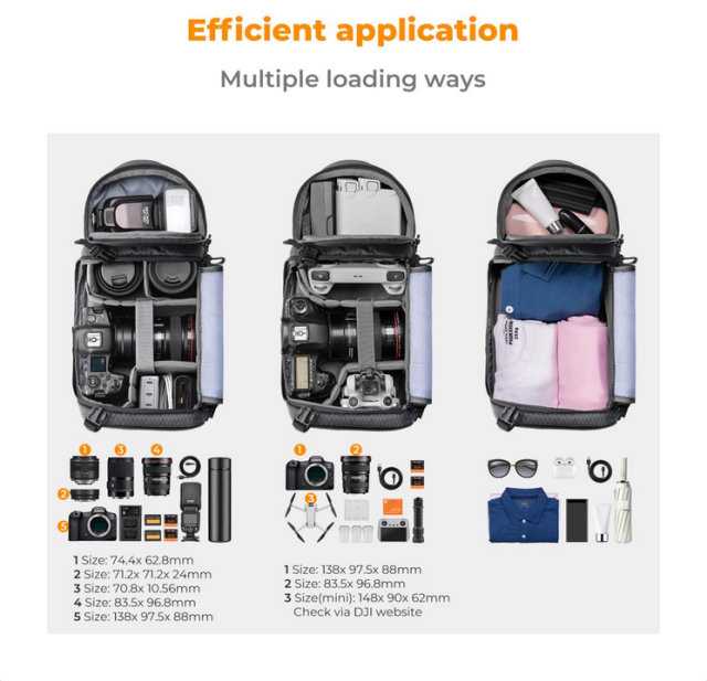 • Diseño espacioso: volumen compacto de 10 l con compartimentos para cámaras, objetivos y accesorios.