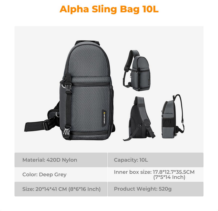 La bolsa K&F Urban Wander 02 Sling Bag, con una capacidad de 10 litros, es una bolsa para cámara diseñada con esmero que combina estilo, practicidad y protección. Con unas dimensiones de 16 x 8 x 6 pulgadas, ofrece suficiente espacio de almacenamiento sin renunciar a una forma elegante y compacta. La bolsa cuenta con varios compartimentos que permiten guardar de forma segura la cámara, los objetivos, el trípode, los accesorios y los objetos personales.