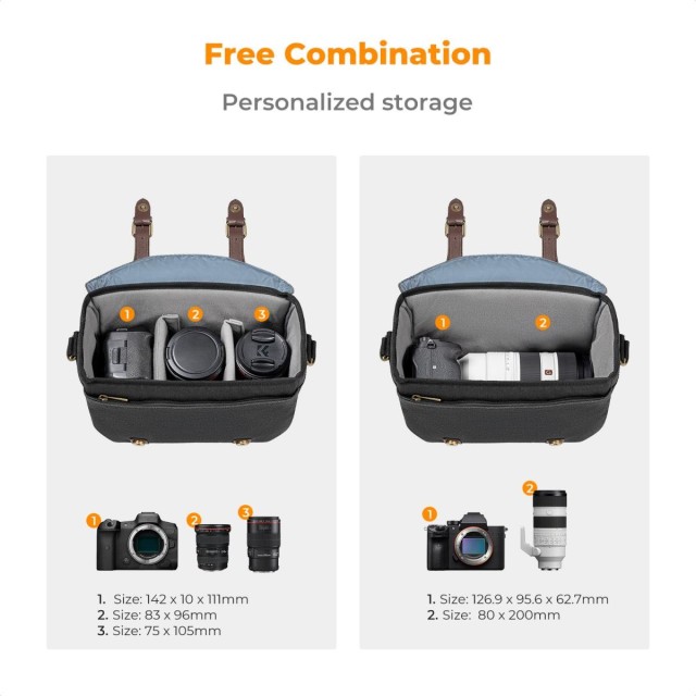 • * 【Espacio personalizable】 Esta bolsa cruzada para cámara cuenta con dos separadores acolchados extraíbles para separar y proteger diferentes cámaras, flashes, objetivos y demás equipo fotográfico; el espacio interior se puede adaptar a tus necesidades.