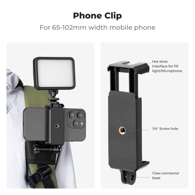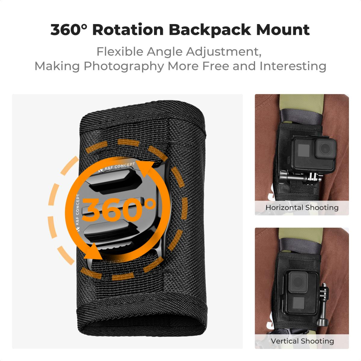 Soporte para correa de hombro y mochila K&F Concept, compatible con GoPro Hero 13/12/11/10/9/8/7/6/5/4 Black, Session, apto para DJI Osmo Action 5 Pro/4/3 y otras cámaras de acción, con rotación de 360°. El soporte cuenta con una base giratoria de 360°, lo que ofrece diversos ángulos de grabación y permite girar la cámara para crear la toma perfecta. Instala la cámara de acción, colócala en la base del soporte, fíjala a la correa para el hombro y gira para ajustar el ángulo y capturar perspectivas únicas; diseño con clip de sujeción rápida, fácil cambio de dispositivo.