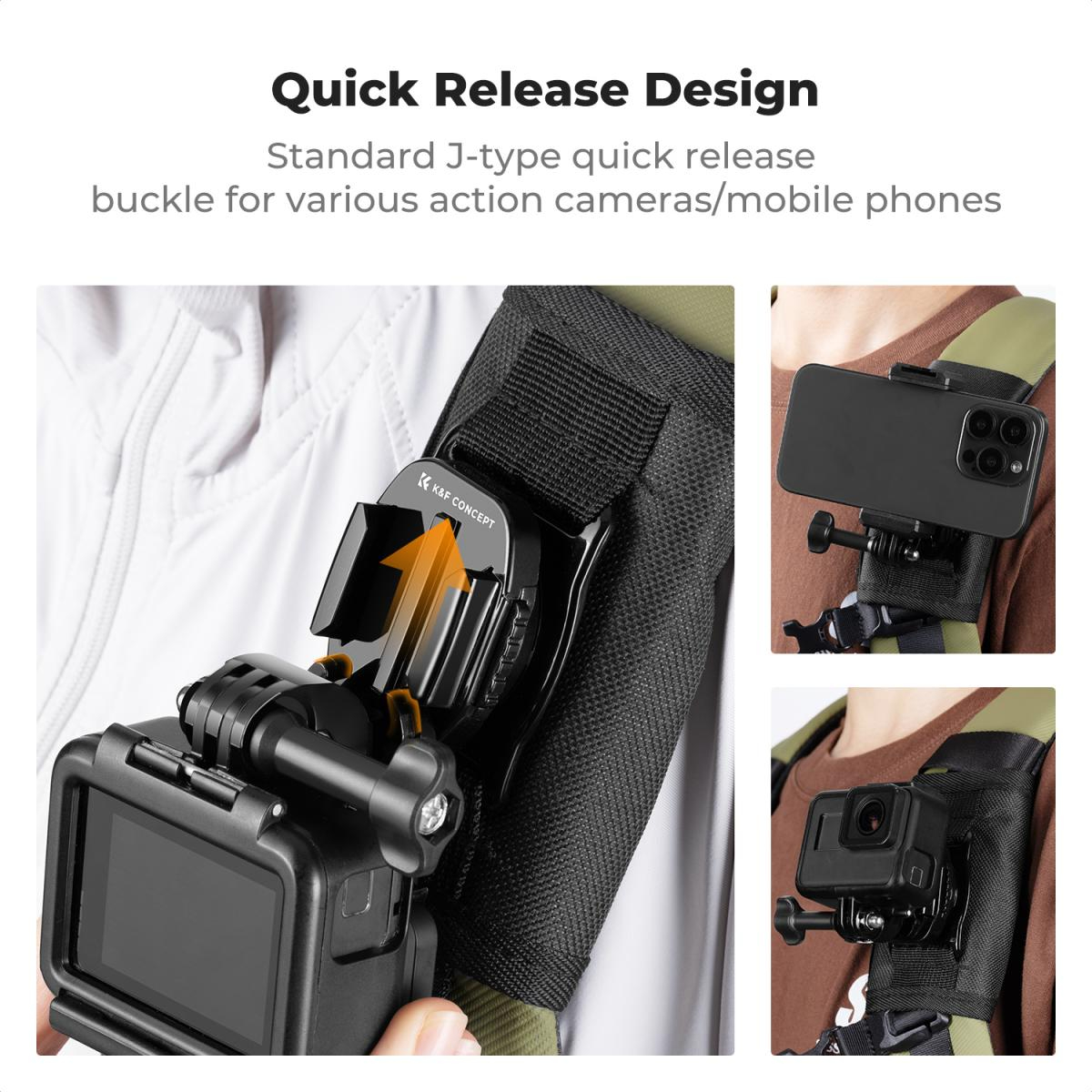 Soporte para correa de hombro y mochila K&F Concept, compatible con GoPro Hero 13/12/11/10/9/8/7/6/5/4 Black, Session, apto para DJI Osmo Action 5 Pro/4/3 y otras cámaras de acción, con rotación de 360°. El soporte cuenta con una base giratoria de 360°, lo que ofrece diversos ángulos de grabación y permite girar la cámara para crear la toma perfecta. Instala…