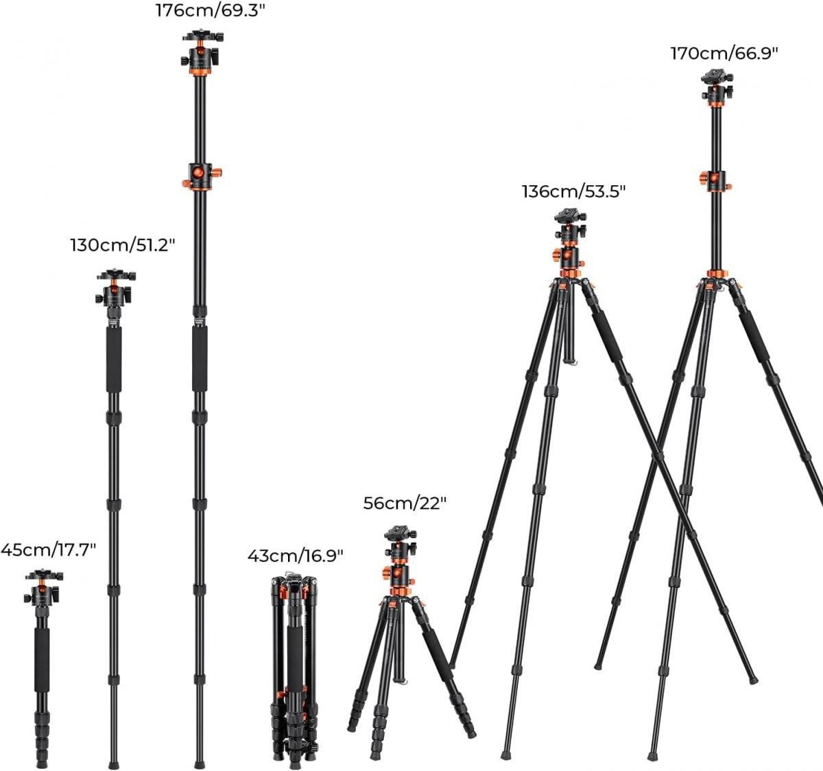 Trípode con columna central transversal. La columna central se mueve en un rango de 0 a 180 grados y se puede girar 360° en el plano horizontal, lo que permite tomar fotografías panorámicas.