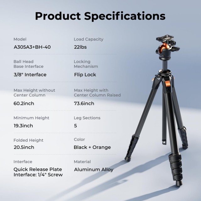 El K&F Concept A305A3+BH-40 es un trípode de aluminio compacto y ligero diseñado para fotógrafos y creadores de contenido que necesitan estabilidad, versatilidad y portabilidad. Está equipado con una rótula de 40 mm, giro panorámico de 360° y columna central ajustable, y es compatible con cámaras, smartphones y tabletas para viajes, estudio…