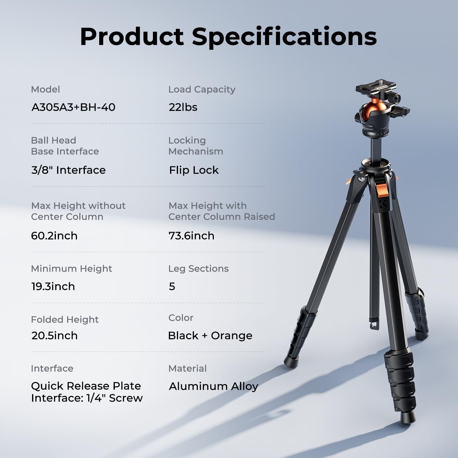 El K&F Concept A305A3+BH-40 es un trípode de aluminio compacto y ligero diseñado para fotógrafos y creadores de contenido que necesitan estabilidad, versatilidad y portabilidad. Está equipado con una rótula de 40 mm, giro panorámico de 360° y columna central ajustable, y es compatible con cámaras, smartphones y tabletas para viajes, estudio y fotografía en exteriores.