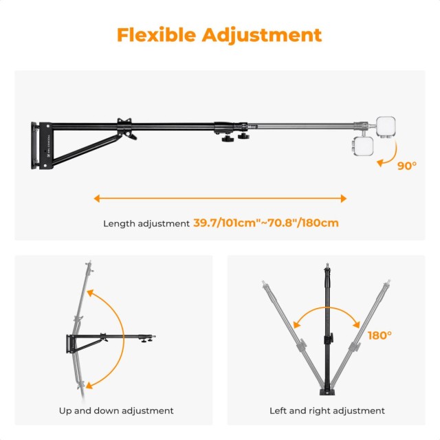Se fija de forma segura a la pared y, cuando no se utiliza, se pliega hasta alcanzar una longitud compacta de 93,5 cm (36,8"), lo que libera un valioso espacio en el suelo y mantiene tu estudio ordenado. El brazo cuenta con una oscilación vertical de 180° y una rotación horizontal de 180°, lo que permite un ajuste versátil del ángulo. Cuando no se utiliza, se puede plegar contra la pared para ahorrar espacio. Es ideal para fijar luces fotográficas, dispositivos de seguimiento o monitores, y satisface requisitos de posicionamiento complejos, como la inclinación, la rotación y la extensión.
