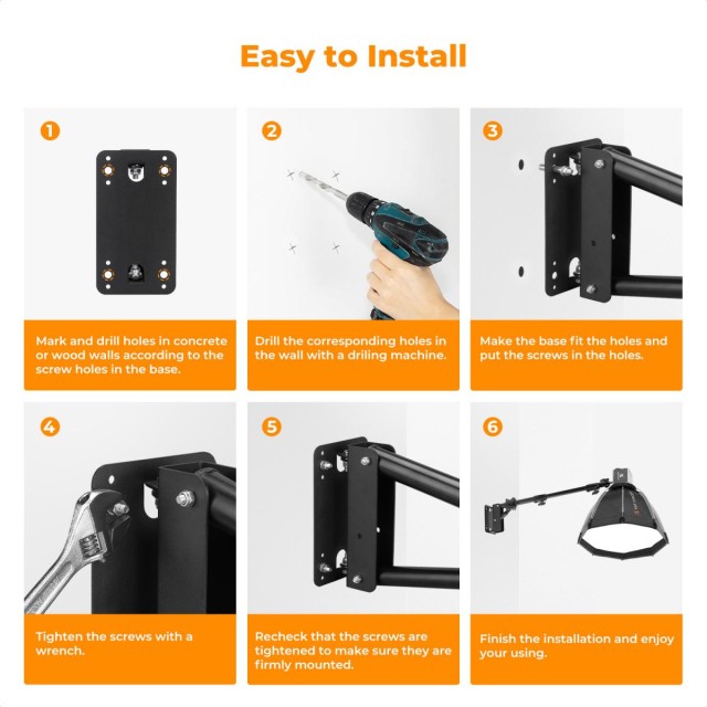 • * 【Instalación segura】El brazo está fabricado en metal resistente y anticorrosivo con acabado negro, lo que garantiza su durabilidad y solidez. Se suministra con cuatro tornillos de expansión para una fijación segura en paredes de hormigón, lo que asegura una configuración estable y segura.