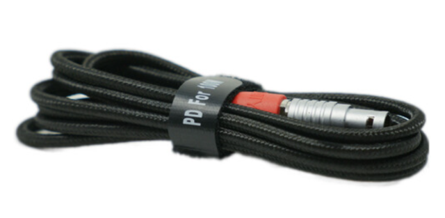 Cable de alimentación trenzado de 100 W: cable trenzado de nailon de 1,5 m con conector rectangular de 2 pines compatible con LEMO → conector USB-C rectangular. Suministra 100 W (20 V/5 A) desde cualquier fuente PD (adaptador de pared, batería externa o V-mount con salida USB-C PD) directamente a la entrada de 11–19 V de la cámara, sin D-Tap ni reguladores de tensión.