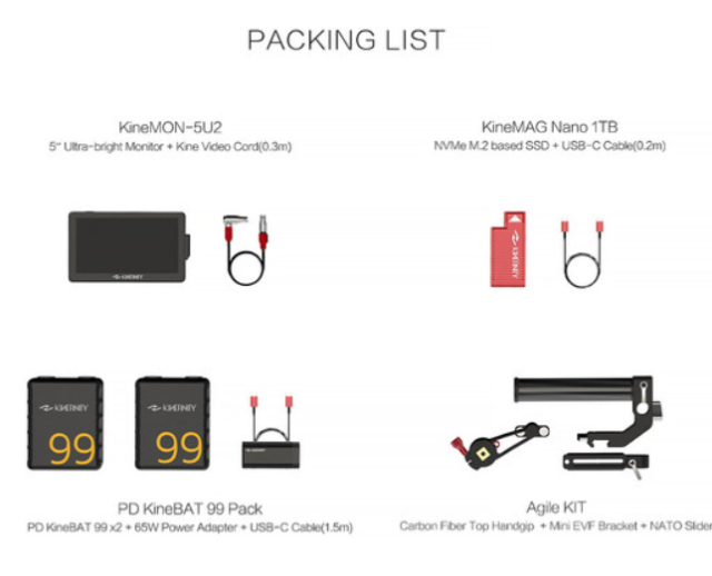 El paquete Kinefinity MAVO mark2 Agile Pack (A901-004-01) incluye una pantalla táctil KineMON 5U II de 2000 nits, un SSD KineMAG Nano de 1 TB, 2 baterías PD KineBAT 99 (95 Wh con montura en V y USB-C PD), un cargador dual y un asa superior de carbono: el kit ideal para los propietarios de una MAVO mark2 LF/S35.