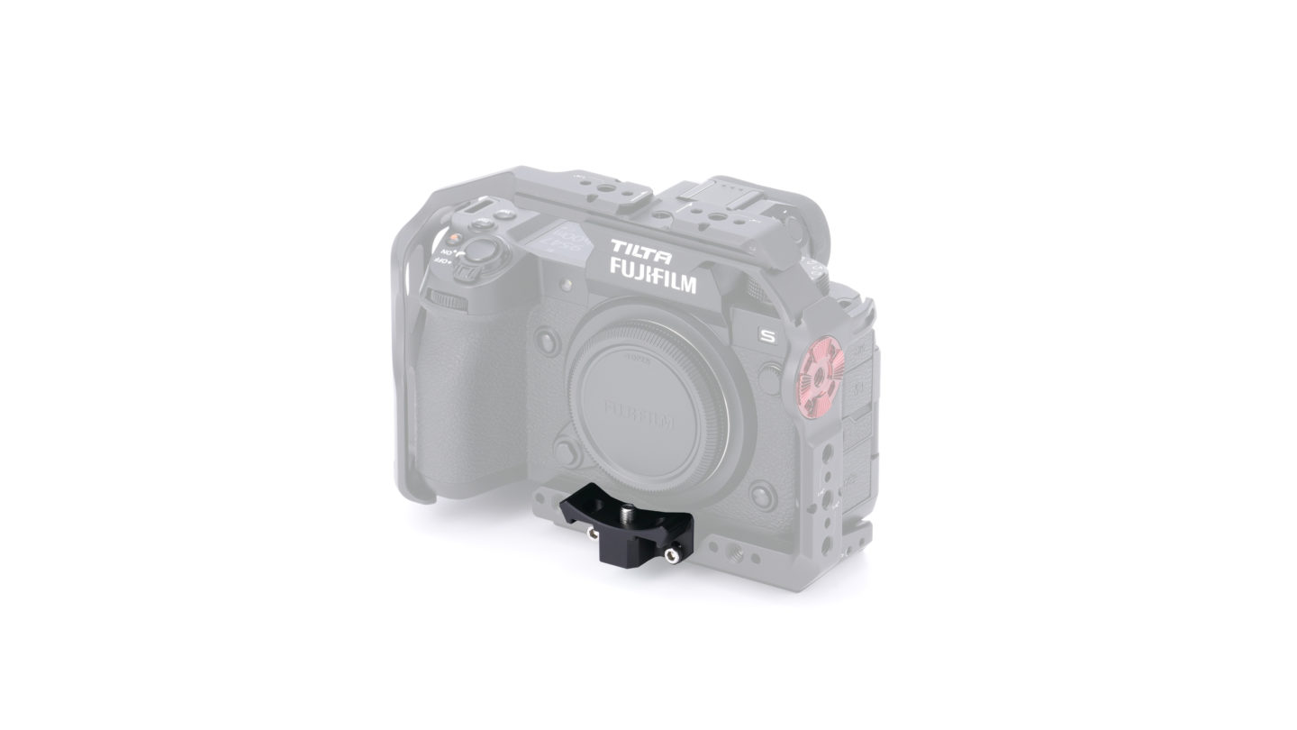 Este soporte para adaptador de objetivo se fija a la parte delantera de nuestra jaula para la cámara Fujifilm X-H2S y proporciona un soporte adicional para los objetivos VILTROX EF-FX1 y NF-FX1.