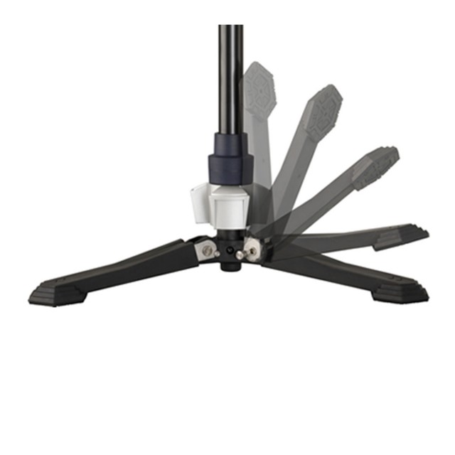 El bloqueo y desbloqueo del trípode se realiza pisando el pedal con el pie: con una sola pisada, bloqueas el monopié en posición autónoma o lo devuelves al modo de movimiento libre de la rótula en la base. El modo de pie libre le deja las manos libres y le permite dedicarse por completo a ajustar el equipo entre tomas, sin tener que apoyar todo el conjunto de la cámara. El cambio de bloqueo se indica con un «clic». Tras cambiar a la posición de grabación libre, entra en acción la rótula de la base del monopié, que garantiza panorámicas e inclinaciones perfectamente fluidas. El monopié es ideal para equipos pequeños o grabaciones en solitario, por ejemplo, entrevistas, documentales, paisajes naturales, eventos sociales, etc.