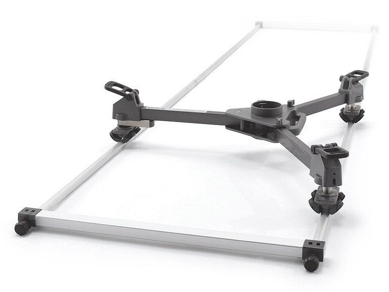 La base cuenta con hasta 12 ruedas de goma (4 ruedas por pata) montadas en ángulo para garantizar un desplazamiento fluido y suave por una pista recta. Gracias a la pata ajustable y deslizante, la base con raíles no tiene ningún problema ni en las curvas y garantiza un movimiento fluido y sin interrupciones. Además, las ruedas de goma son capaces de absorber incluso pequeñas partículas de suciedad y no transmiten su efecto a la imagen.