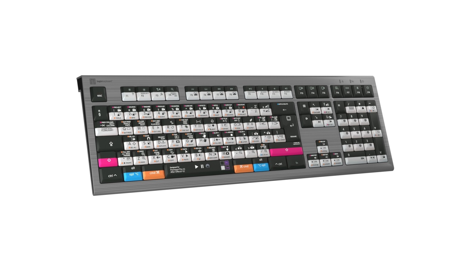 Este teclado Logickeyboard está diseñado para editores de vídeo y creadores de películas que trabajan con los programas Adobe Premiere Pro y Adobe After Effects. Los cineastas pueden cambiar fácilmente entre sus aplicaciones de edición y tener siempre a mano todos los atajos de teclado necesarios. Gracias a los atajos de comando marcados en las teclas y a su codificación por colores, te convertirás en un experto en el manejo de Premiere Pro y After Effects en un abrir y cerrar de ojos. El teclado Logickeyboard es ideal para cineastas, estudios de posproducción, salas de edición profesionales y todos aquellos que trabajan intensamente con los programas Premiere Pro y After Effects.