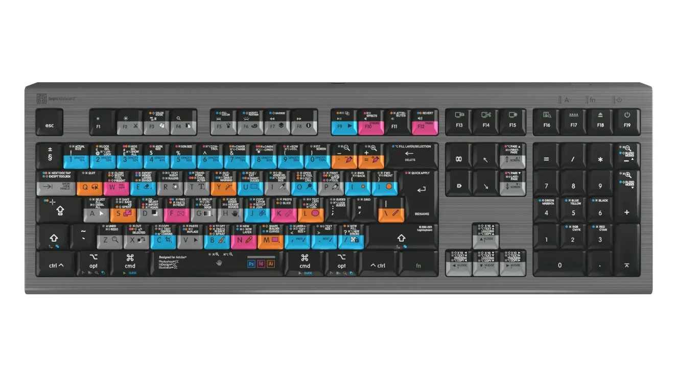 El teclado para Adobe Graphic Designer Shortcut Keyboard es el primer teclado 3 en 1 que ha fabricado Logickeyboard. Funciona con las tres aplicaciones de Adobe más populares para el diseño gráfico —Photoshop CC, Illustrator CC e InDesign CC— y te ofrece más de 225 atajos de teclado en un solo teclado. El teclado Adobe Graphic Designer Keyboard te permite cambiar fácilmente de una aplicación a otra sin perder de vista los atajos de teclado más importantes.