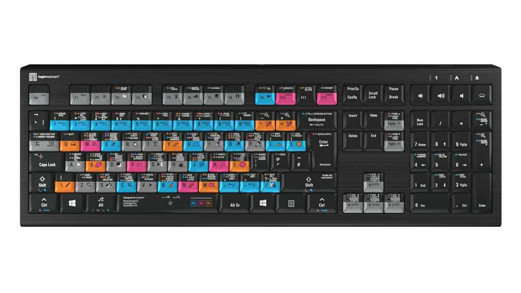 El teclado para Adobe Graphic Designer Shortcut Keyboard es el primer teclado 3 en 1 que ha fabricado Logickeyboard. Funciona con las tres aplicaciones de Adobe más populares para el diseño gráfico —Photoshop CC, Illustrator CC e InDesign CC— y te ofrece más de 225 atajos de teclado en un solo teclado. El teclado Adobe Graphic Designer te permite cambiar fácilmente entre aplicaciones sin perder de vista los atajos de teclado más importantes.