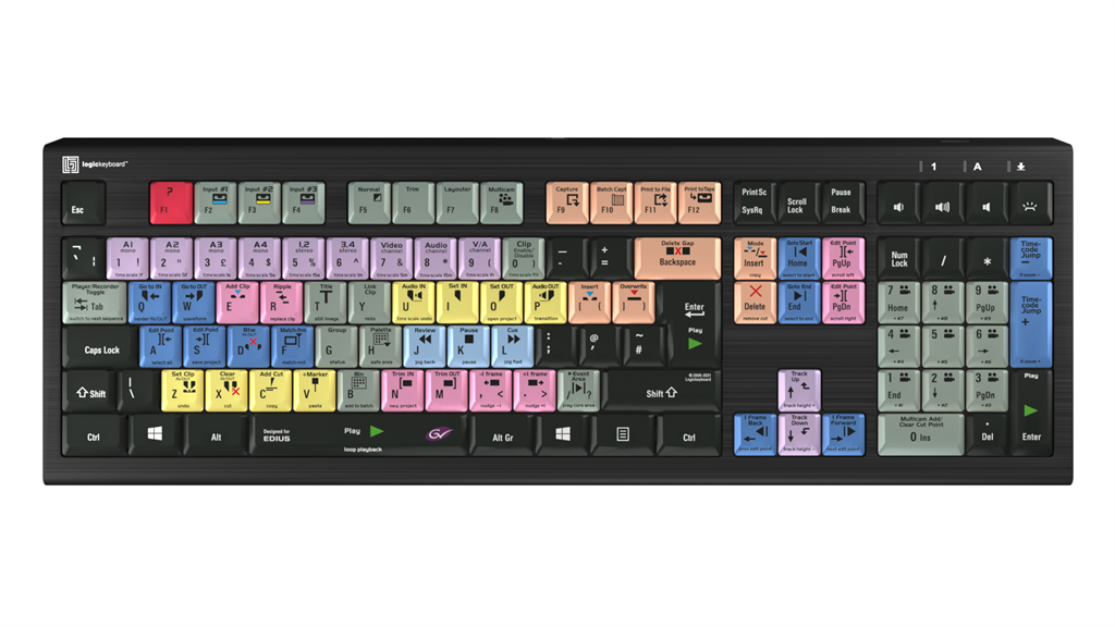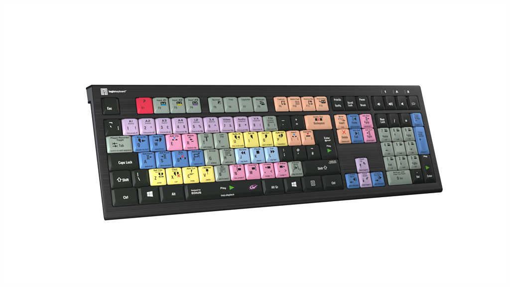 El teclado especial Grass Valley Edius Logickeyboard también incluye todas las letras, números y símbolos habituales que se encuentran en un teclado convencional, por lo que puede utilizarse fácilmente como sustituto de este. El teclado se conecta fácilmente y no requiere la instalación de ningún software.