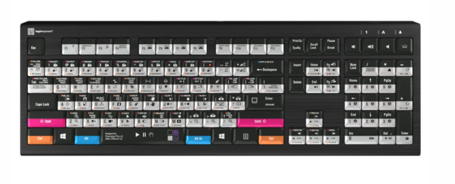 El teclado Logickeyboard Adobe Filmmaker Pr+Ae ASTRA 2 PC es un teclado profesional retroiluminado diseñado para editores de vídeo y cineastas que utilizan las aplicaciones Adobe Premiere Pro y After Effects. Gracias a sus más de 220 atajos de teclado diferenciados por colores, su concentrador USB 3.0 y sus teclas sensibles con mecanismo de tijera, optimiza el flujo de trabajo y aumenta la productividad.