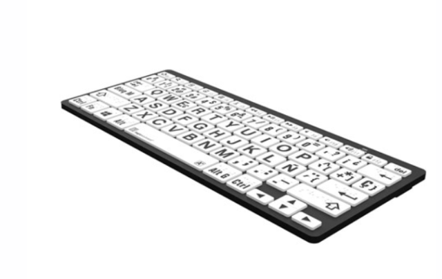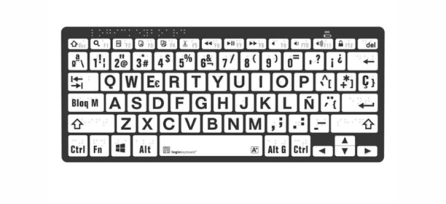 El teclado auxiliar Logickeyboard Braille/LargePrint Black on White para PC es un teclado accesible que se conecta por Bluetooth y está diseñado para usuarios con discapacidad visual. Gracias a sus letras grandes y a los caracteres en braille en relieve, ofrece a los usuarios de Windows una experiencia de escritura clara, inclusiva y eficaz.