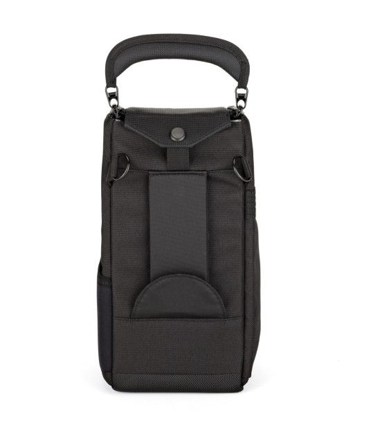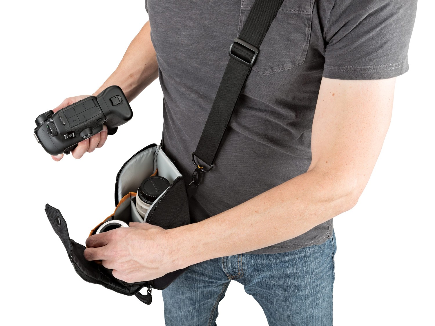 El diseño de doble compartimento se amplía para albergar temporalmente dos objetivos durante el cambio, lo que mantiene tu equipo seguro y a mano. El bolsillo lateral de neopreno ofrece un cómodo espacio para guardar las tapas de los objetivos o el cuerpo de la cámara y evita que se pierdan al cambiar el equipo. La asa principal, con un agarre cómodo, aumenta el control y la rapidez de uso.