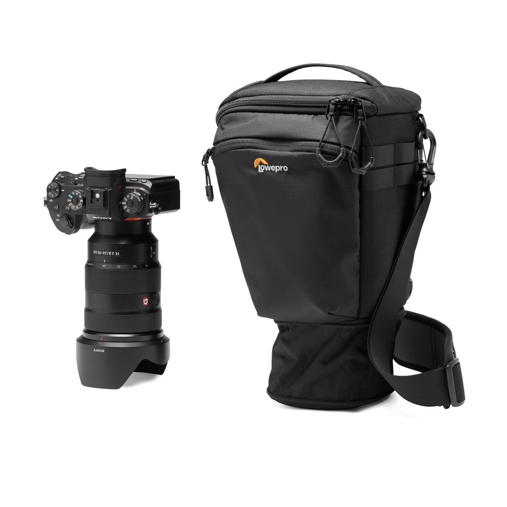 La bolsa Lowepro ProTactic TLZ 75 Slim AW III, diseñada para fotógrafos profesionales que viajan, es una bolsa para cámara con acceso superior, pensada para guardar cámaras réflex de formato completocon el objetivo montado (hasta 70–200 mm F2,8) y equipada con una sección ampliable para el parasol en posición de disparo. La puerta de la bolsa se abre hacia un lado, lo que permite un acceso rápido y ergonómico a tu equipo, mientras que el separador interior garantiza la seguridad de la cámara o permite alojar un juego de dos objetivos.