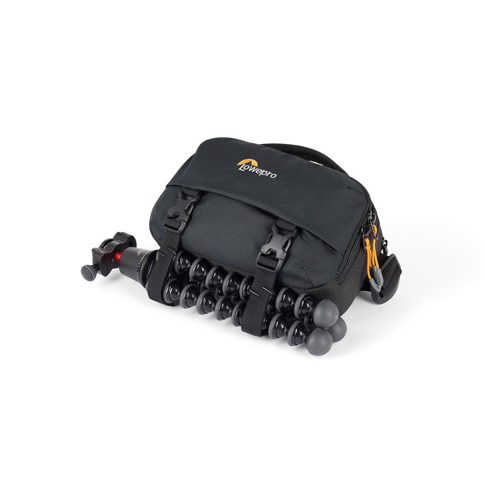 La riñonera negra Lowepro Trekker Lite HP 100 Hip Pack tiene capacidad para una cámara pequeña con sensor recortado, como por ejemplo la Sony Alpha 6400 o una cámara similar sin visor, pero con dos objetivos pequeños, o bien una cámara compacta y una cámara de acción.