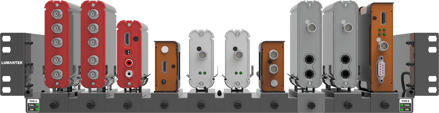 El Rackmount es quizás uno de los productos más sencillos de LUMANTEK. Sin embargo, es el único producto que te puede ahorrar todos los cables y el desorden que provocan las múltiples conexiones de los convertidores. Además, solo necesitas 2 adaptadores de corriente en lugar de usar uno por cada convertidor.