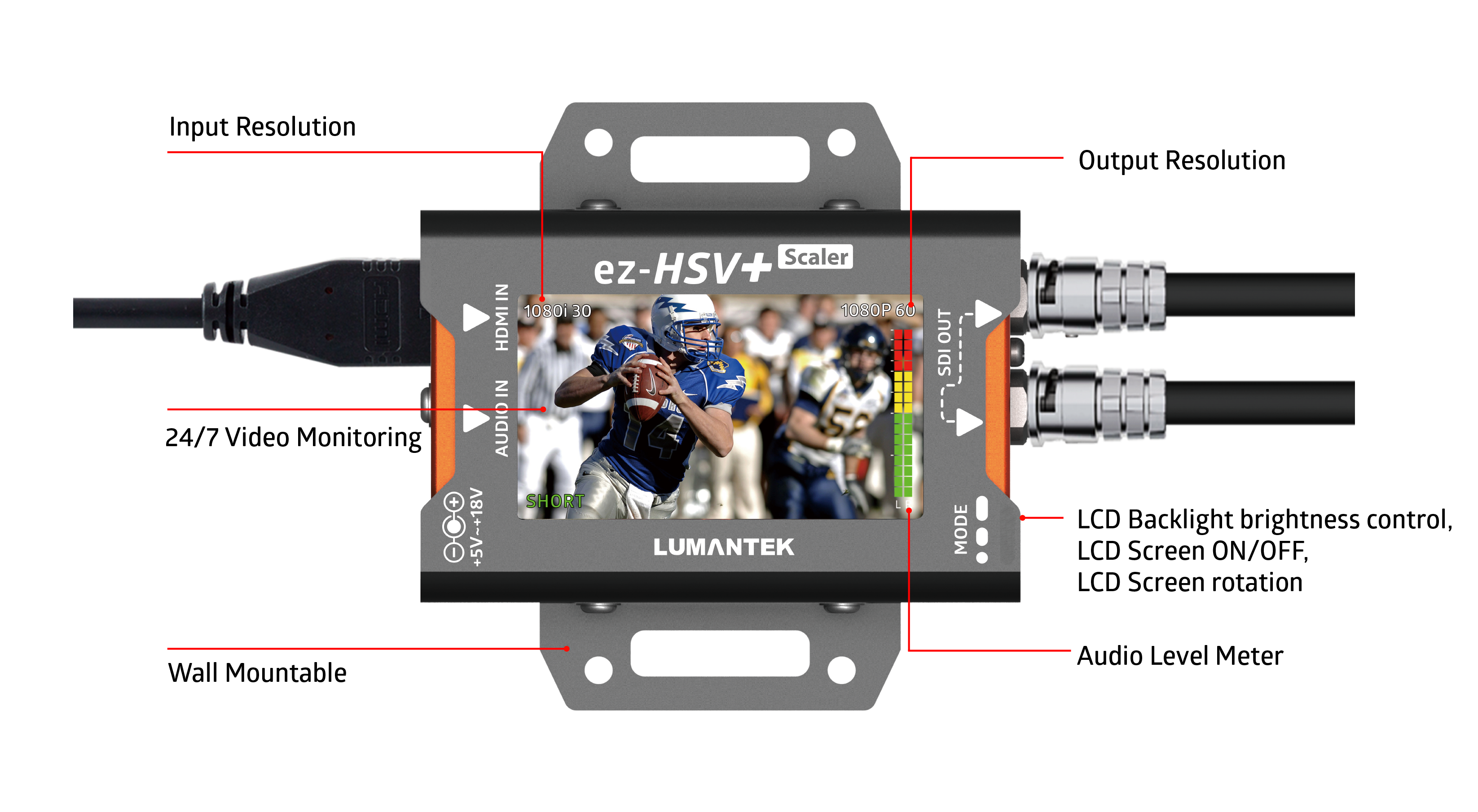 Ahora puedes ver vídeo HDMI con el ez-HSV+. Las funciones que puedes controlar son la banda de audio, la resolución de entrada y la resolución reducida. El dispositivo ez-HSV+ también cuenta con la opción de insertar audio externo, lo que te permite planificar el esquema de producción con mayor comodidad.
