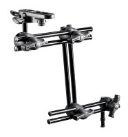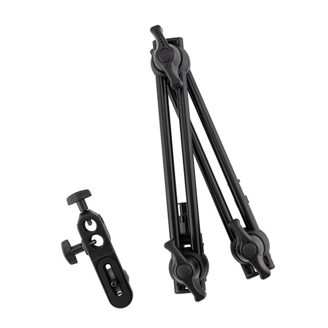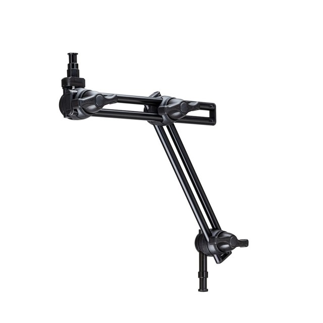 El Manfrotto 396B-2 cuenta con dos secciones articuladas con extensión deslizante que se fijan al instante mediante palancas ergonómicas de cierre rápido, y alcanza una longitud de 62,5 cm para un ajuste preciso por encima de la cabeza, desde un lado o desde un ángulo bajo. El soporte superior para la cámara incluye una rosca interna de 3/8"-16 y un tornillo de 16 mm, mientras que el pivote inferior combina un perfil hexagonal antideslizante (compatible con Super Clamp) con una pieza redonda universal de 16 mm para trípodes o abrazaderas. El marco de aluminio anodizado negro, con una capacidad de carga de 5 kg, resiste la flexión y el desgaste, lo que lo hace ideal para fotografía de productos, videovigilancia o trabajo con paneles LED, flashes o cámaras pequeñas: es compacto, resistente e infinitamente ajustable.