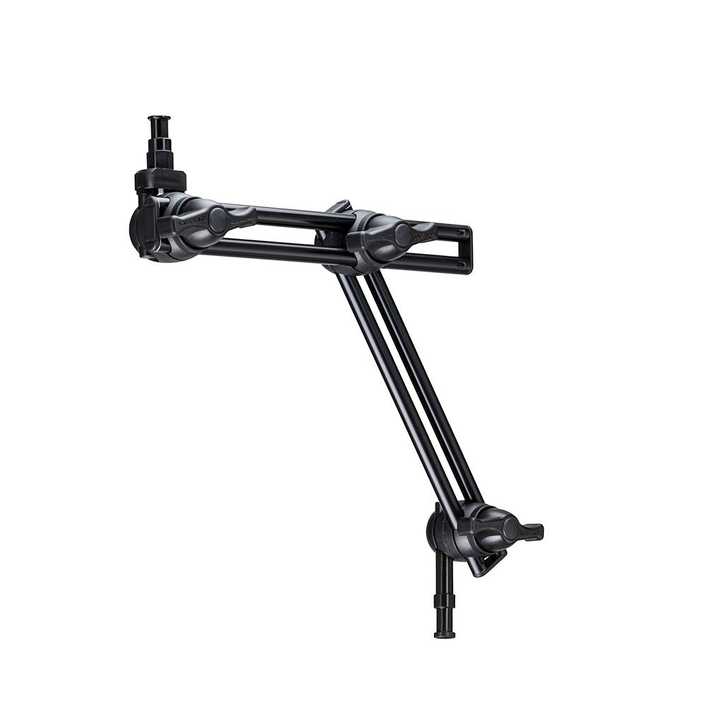 El brazo articulado doble de dos secciones Manfrotto 396B-2 es un brazo de aluminio negro de 640 g con una parte extensible (hasta 62,5 cm), una capacidad de carga de 5 kg, un sistema de bloqueo rápido, un soporte para cámara con rosca interna de 3/8" + rosca externa de 5/8" y un pivote inferior antideslizante hexagonal/universal de 16 mm, que garantiza una colocación robusta y versátil de luces, cámaras o monitores en el estudio o en exteriores.
