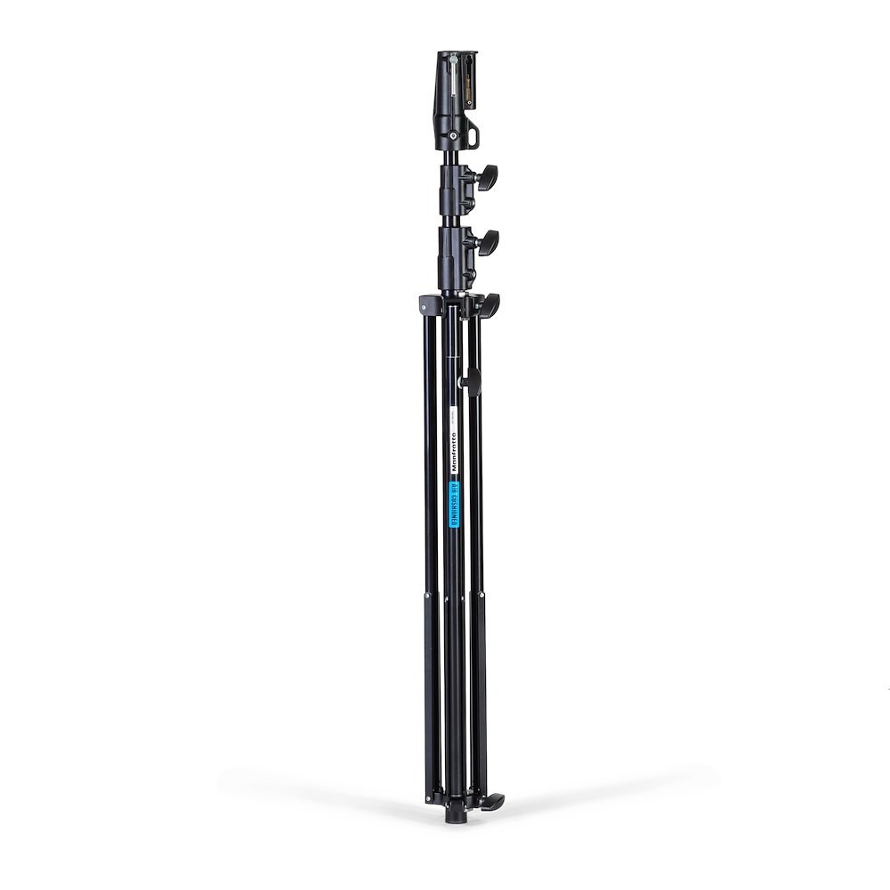 El Manfrotto 007BUAC Black Air Cushioned Aluminium Senior Stand es un trípode de aluminio resistente y portátil de 3 kg con patas neumáticas de tres secciones, que se puede extender hasta una longitud de 124–315 cm y soporta 12 kg (2,5 kg con la extensión máxima), con patas de doble refuerzo, un acoplamiento universal de 28 mm + un pivote de 16…