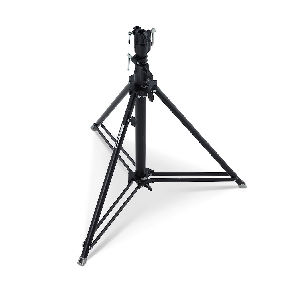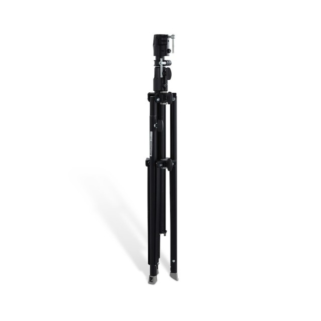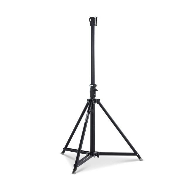 El trípode Manfrotto 070BU cuenta con un bastidor de aluminio anodizado negro que pesa 6,2 kg. Dos puntales neumáticos se extienden hasta una altura máxima de 147 cm mediante cierres suaves, mientras que las patas dobles de acero cromado y la amplia base de 120 cm de ancho garantizan una flexibilidad nula con cargas de hasta 35 kg. El cabezal universal tipo 14 está equipado con una rosca de 28 mm y un pasador de 16 mm con pestillo de seguridad, compatible con todos los elementos de fijación estándar. Una pata niveladora se ajusta en un rango de ±15° para compensar la inclinación, y la baja altura mínima de 88 cm garantiza que los operadores no tengan ninguna limitación. Con una altura plegada de 105 cm, es el soporte ideal para teatros, actuaciones en directo o estudios de cine, donde la altura, la estabilidad y el traslado rápido son imprescindibles.