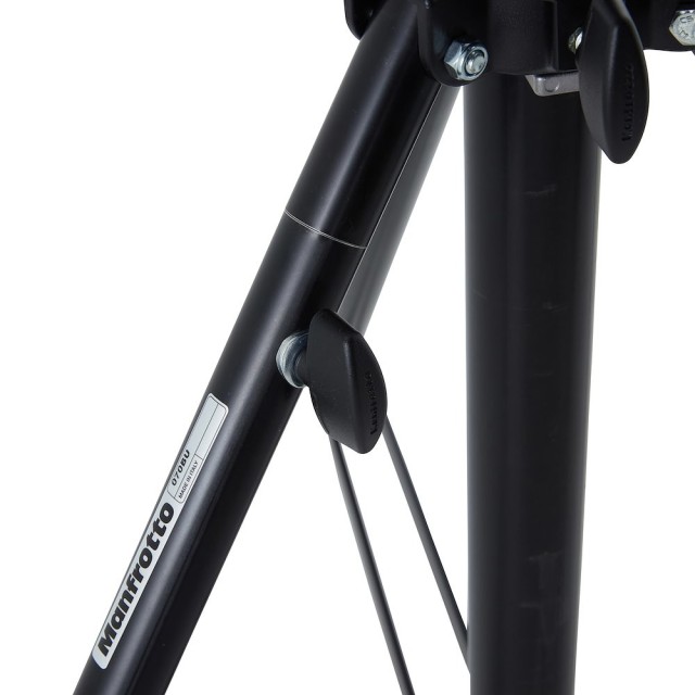 El trípode de aluminio negro Manfrotto 070BU para focos de seguimiento es un trípode resistente de dos secciones que pesa 6,2 kg y se puede extender hasta una longitud de 88–147 cm, soporta 35 kg y cuenta con patas dobles de acero cromado, un abrazador universal de 28 mm + cabezal de pivote de 16 mm y una pata de nivelación; proporciona una gran estabilidad para focos de seguimiento, proyectores o grandes luminarias en el estudio o en terrenos irregulares.