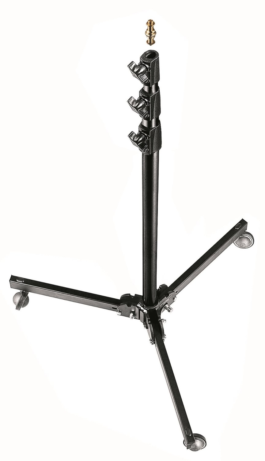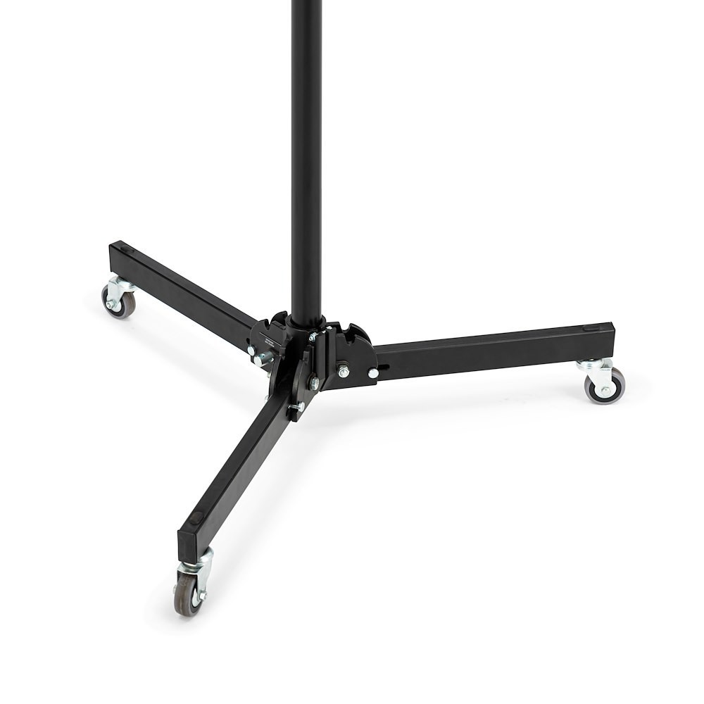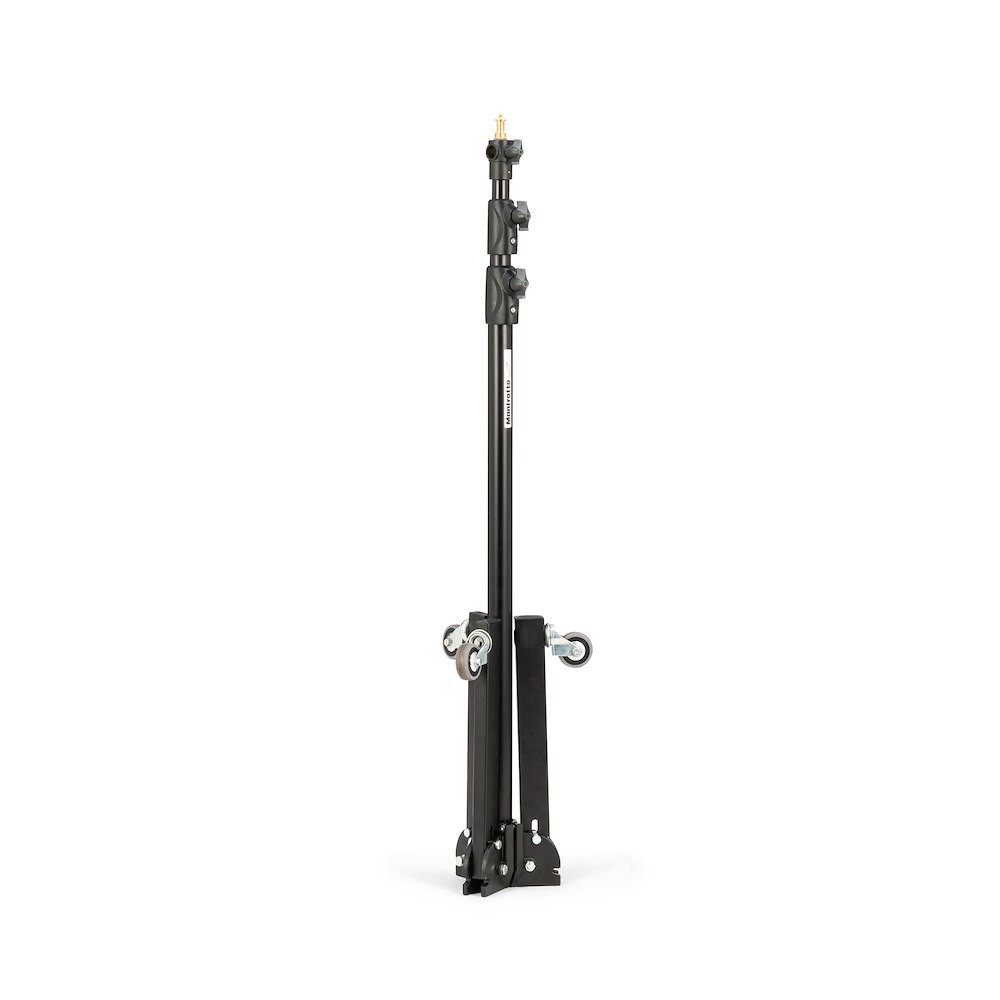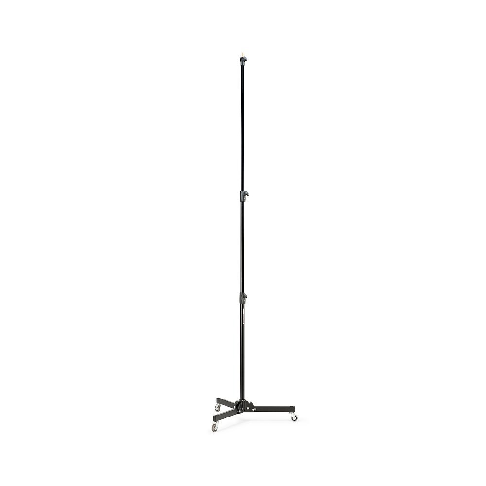 El Manfrotto 299B es un trípode clásico de acero negro con una base baja, brazos de altura de aluminio anodizado plateado, ruedas con freno y una pata de nivelación; alcanza una altura de 272 cm y soporta con seguridad 12 kg (2,2 kg cuando está completamente extendido). Gracias a su base ancha y estable y a sus ruedas integradas, es el trípode de estudio ideal para iluminación de techo, softboxes grandes o fondos.