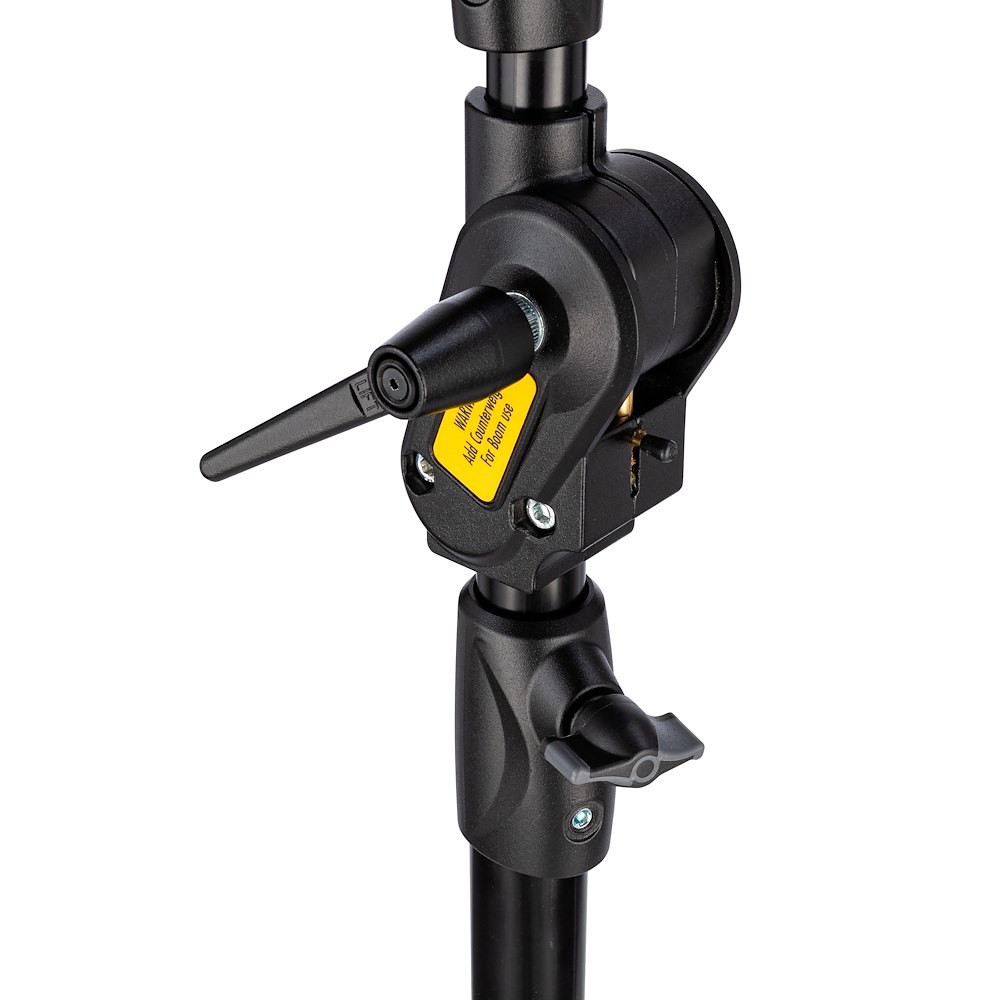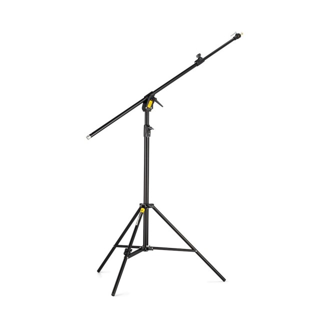 El trípode Manfrotto Combi-Boom Stand es un trípode convertible de aluminio negro ultraligero (2,76 kg) que, con un solo clic, pasa de ser un trípode ligero de 3,9 m (con una capacidad de carga de 9 kg) a un trípode con brazo extensible de 191 cm de altura, ideal para iluminar el cabello, fotografía de productos y pequeños estudios.