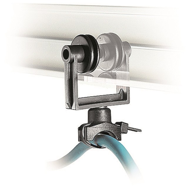 Juego de cinco carros para cables especiales FF3226. Cada carro ligero se inserta directamente en el canal inferior del riel (sin necesidad de ruedas) y se desliza silenciosamente a medida que se mueve el pantógrafo o la luz, lo que evita que los cables cuelguen, se balanceen o se enganchen. Estos resistentes rieles de polímero, ideales para estudios que utilizan múltiples luces en rieles aéreos, admiten cables estándar de cualquier grosor razonable y son la solución recomendada por el fabricante para una gestión limpia y segura de los cables en entornos de televisión, fotografía y producción de vídeo.