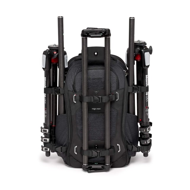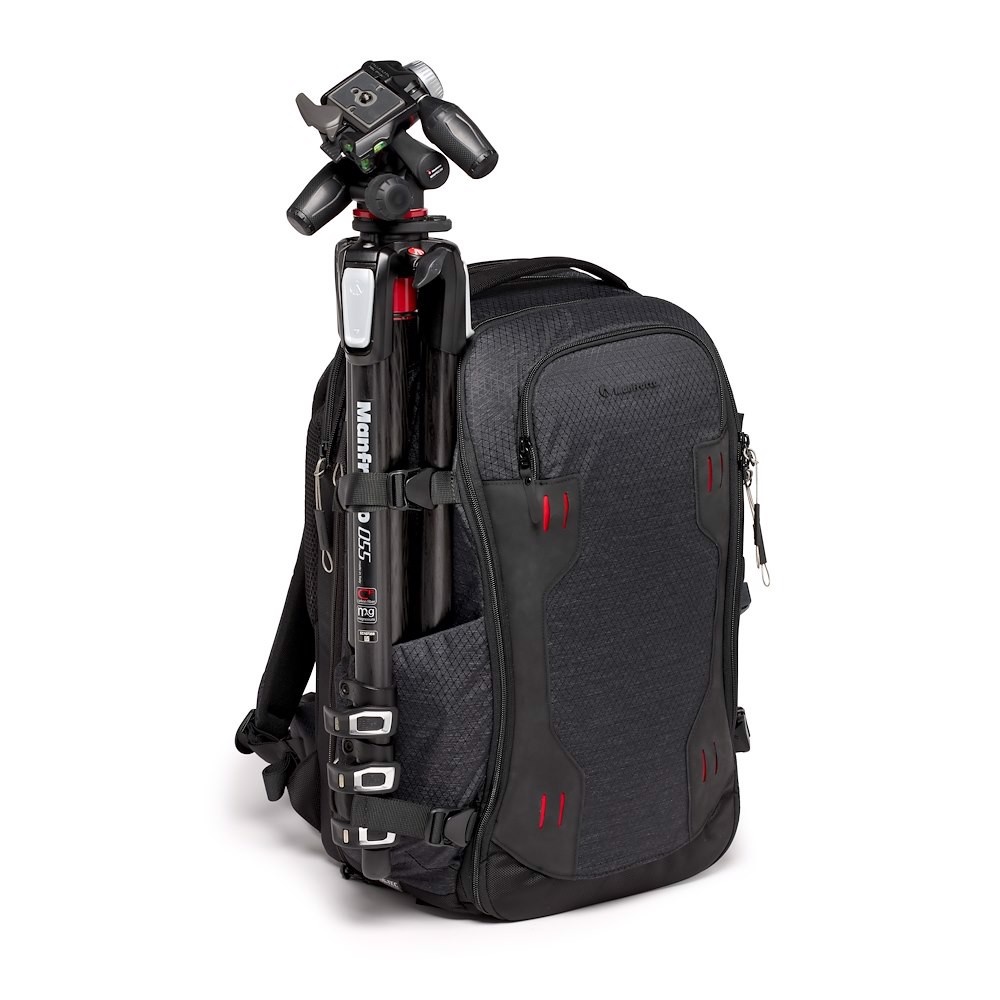 La mochila ofrece varias opciones para fijar el trípode y otros accesorios. En el panel interior, la mochila cuenta con un bolsillo organizador para pequeños accesorios. El paquete también incluye un organizador independiente para cables, cargadores y otros accesorios