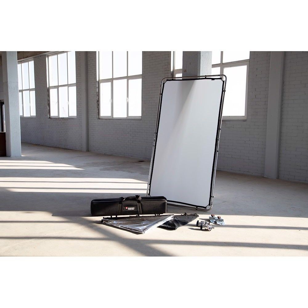 El kit Manfrotto Pro Scrim All In One de 1,1 x 2 m (mediano) incluye: 1 bastidor ligero, 3 fundas de tela (negra, reflectante de doble cara plateada/blanca y difusor de 1,25 grados), 2 cabezales de sujeción, 2 mecanismos de sujeción y una funda de transporte.