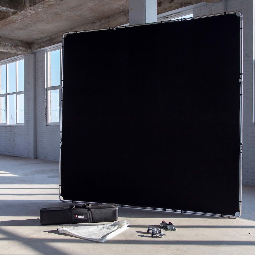 El kit Manfrotto Pro Scrim All In One de 2,9 x 2,9 m (extragrande) incluye: 1 estructura ligera, 2 fundas de tela (una negra y otra difusora de 1,25 grados), 2 cabezales de sujeción, 2 mecanismos de sujeción y una funda de transporte.