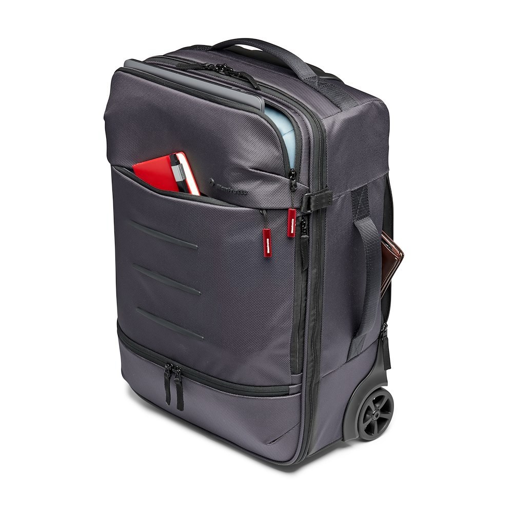 La maleta con ruedas Manfrotto Manhattan Runner-50 es la compañera de viaje ideal para fotógrafos profesionales y viajeros frecuentes. Esta maleta, diseñada para cumplir con las estrictas normas de las aerolíneas en materia de equipaje de mano, combina una protección robusta con una versatilidad increíble. El compartimento principal incluye el innovador interior Flexy Camera Shell, que ofrece una protección totalmente personalizable para cámaras réflex digitales, cámaras sin espejo, objetivos, drones (como la serie DJI Mavic) y otros accesorios. El inserto es extraíble y se puede convertir en una mochila con cómodas correas para los hombros, por lo que obtienes dos bolsas en una. La propia bolsa con ruedas está equipada con ruedas de giro suave y un asa extensible para facilitar el manejo, mientras que el sistema de sujeción para trípode NeverLose te permite transportar de forma segura un trípode o objetos personales, como una chaqueta. El compartimento delantero ofrece un acceso rápido a un portátil de 15 pulgadas, mientras que las correas cruzadas interiores mantienen tus objetos personales bien organizados. El exterior de la bolsa está fabricado con tejido balístico repelente al agua de primera calidad, con una base recubierta para facilitar la limpieza, e incluye una funda impermeable para condiciones climáticas adversas. Con una capacidad de 18,5 l y la capacidad de transportar de forma segura todo el equipo fotográfico, la Manhattan Runner-50 es ideal para fotógrafos y camarógrafos que buscan una solución práctica, resistente y altamente funcional para viajar.