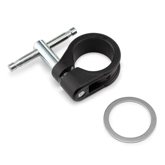 La abrazadera de seguridad Manfrotto 699 de Ø40 mm es un sistema de seguridad secundario diseñado para soportes de altavoces y trípodes, que evita que las partes superiores del soporte se caigan accidentalmente al ajustar la altura.