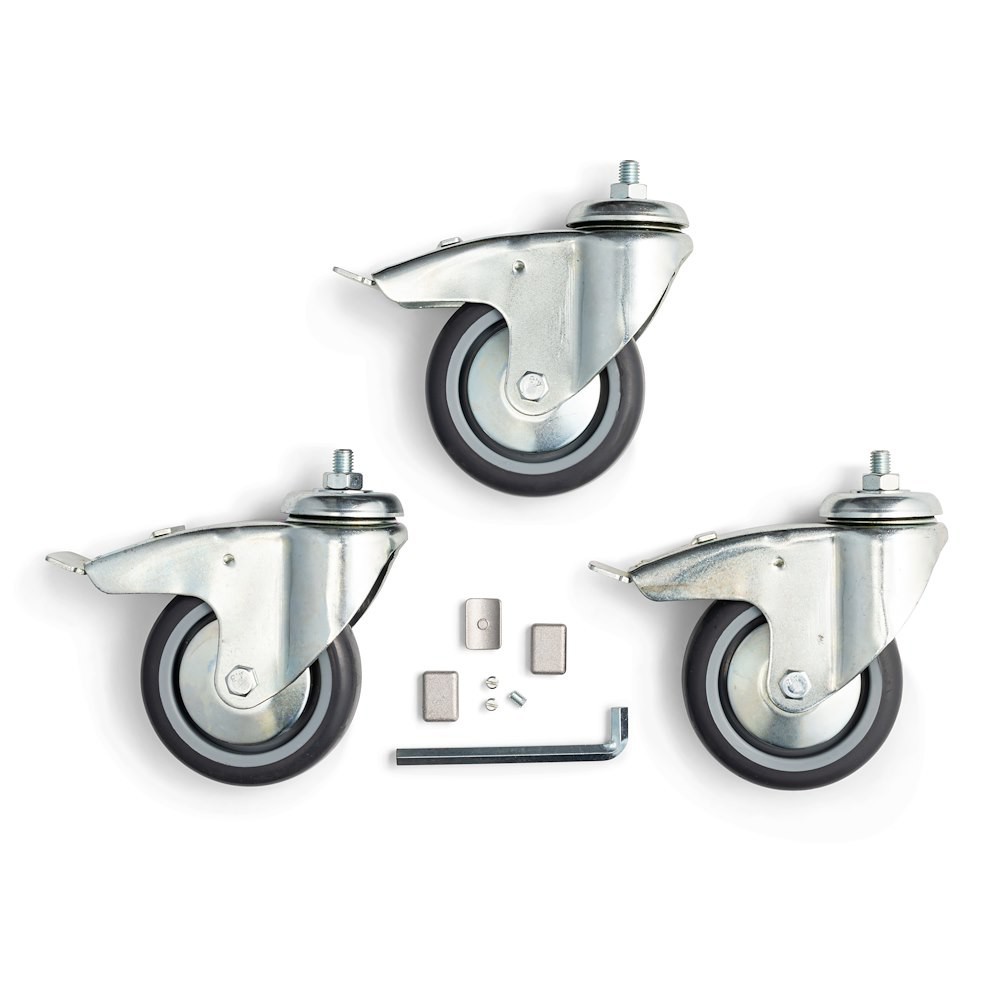 El Manfrotto 104G es un juego de tres ruedas con freno de 100 mm con rosca M10, capaz de soportar una carga total de 100 kg. Garantiza un movimiento suave y bloqueable para la mayoría de los trípodes con rosca M10 (por ejemplo, 087NW, 475B, 269HDB) en un robusto juego de ruedas de estudio de 3 kg.
