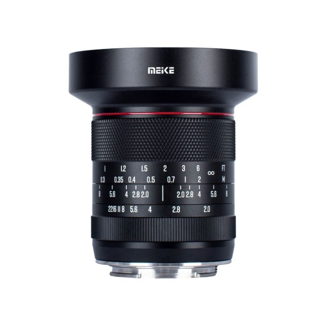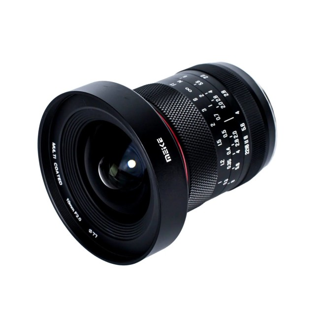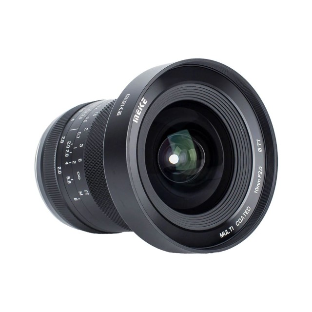 El objetivo totalmente manual Meike 10 mm f/2,0 está diseñado para cámaras con sensores de formato APS-C y se fabrica con monturas Sony E, Fuji X, Canon RF y Nikon Z. Su construcción óptica incluye 15 elementos distribuidos en 12 grupos y un diafragma de 10 láminas. El objetivo ofrece una nitidez y una reproducción del color excelentes.