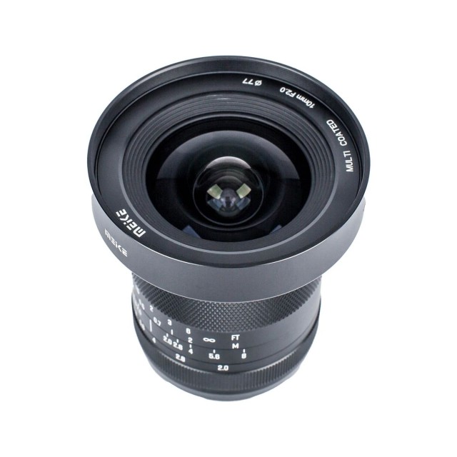 El objetivo totalmente manual Meike 10 mm f/2,0 está diseñado para cámaras con sensores de formato APS-C y se fabrica con monturas Sony E, Fuji X, Canon RF y Nikon Z. Su construcción óptica incluye 15 elementos distribuidos en 12 grupos y un diafragma de 10 láminas. El objetivo ofrece una nitidez y una reproducción del color excelentes.