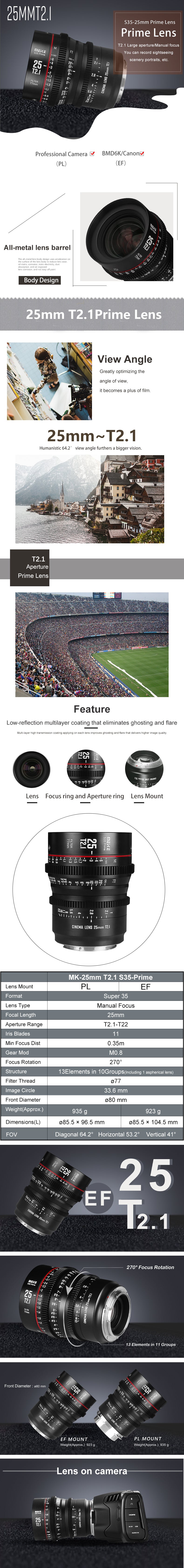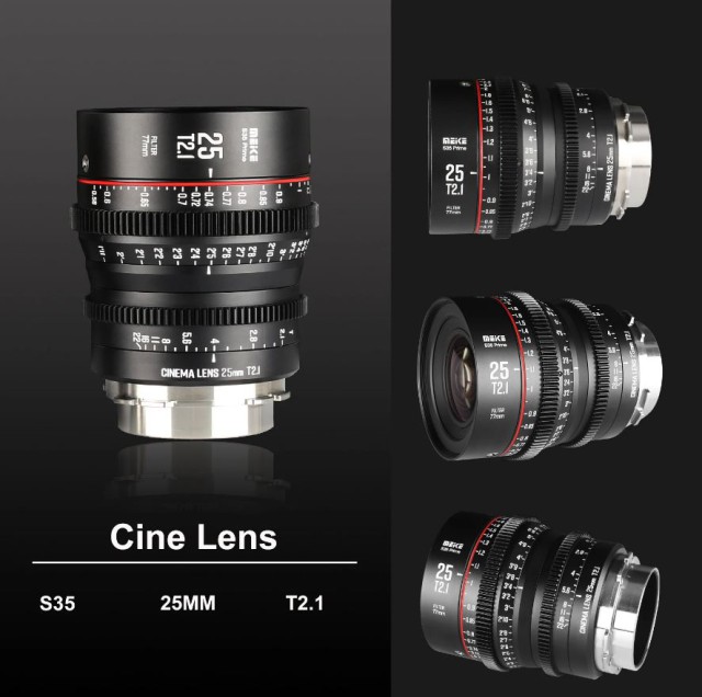 El cuarto objetivo cinematográfico de Meike de la serie Super35-Prime Cine Lens: el Meike 25 mm T2.1. Con un círculo de imagen de 33,6 mm, es adecuado para cámaras de formato Super 35 y se suministra con dos monturas: PL y EF. Este objetivo es uno de los objetivos cinematográficos de Meike de la nueva serie Super35-Prime Cine Lens.Cuenta con un paso de dentado estándar de 0,8 mm en los anillos de enfoque y diafragma.