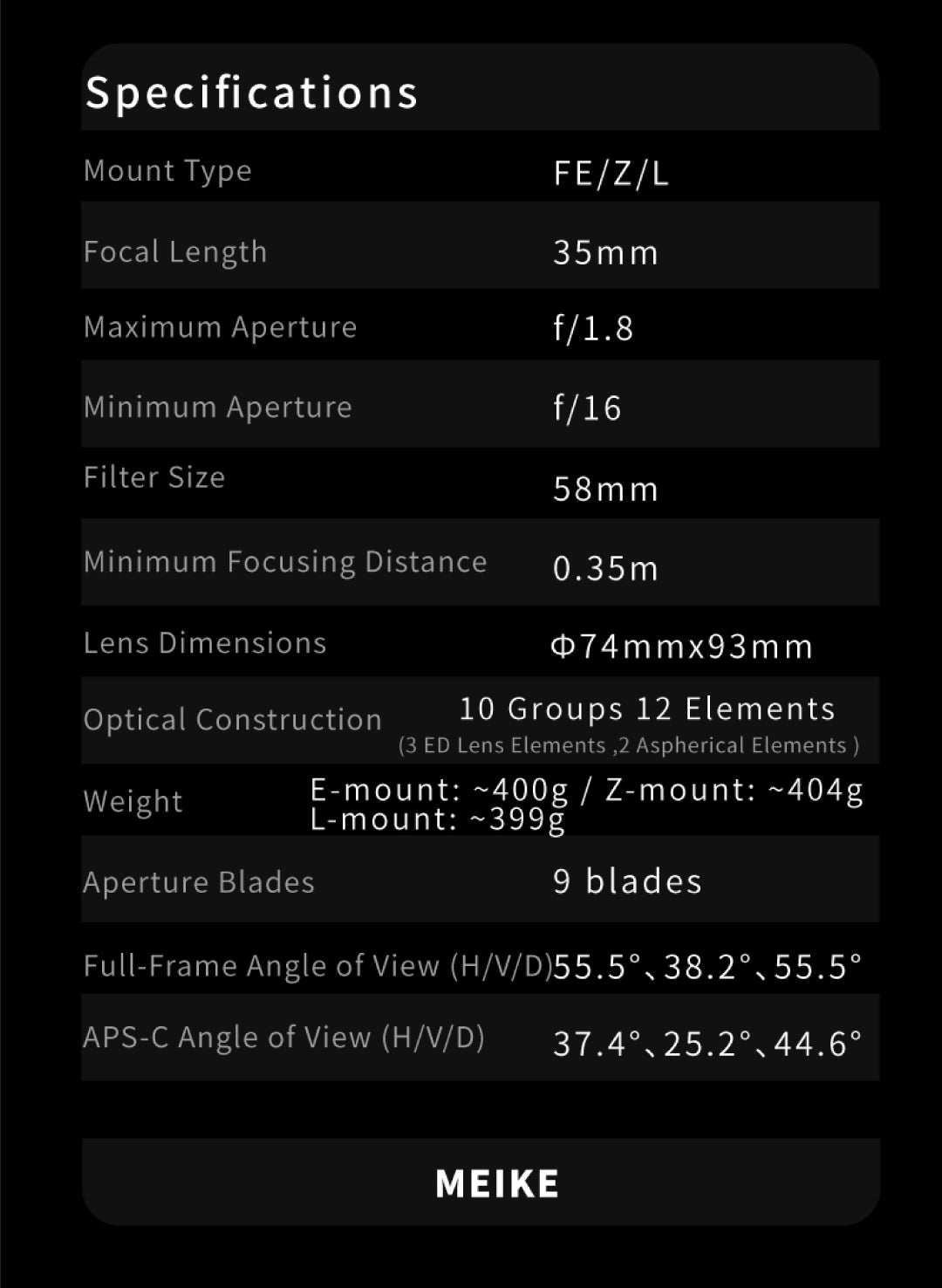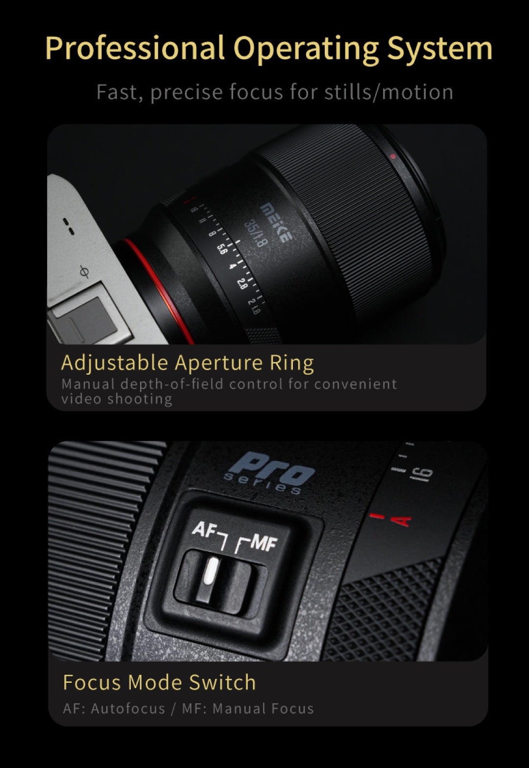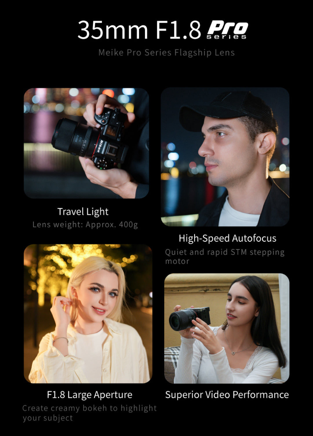 Objetivo Meike 35 mm f/1,8 Pro Full Frame con enfoque automático STM para cámaras Nikon con montura Z. Captura imágenes impresionantes con elobjetivo Meike 35 mm f/1,8 STM con enfoque automático, diseñado específicamentepara cámaras Nikon de formato completo. Este versátil objetivo básico ofrece una apertura de f/1,8, ideal para conseguir un magnífico bokeh y excelentes resultados en condiciones de poca luz.