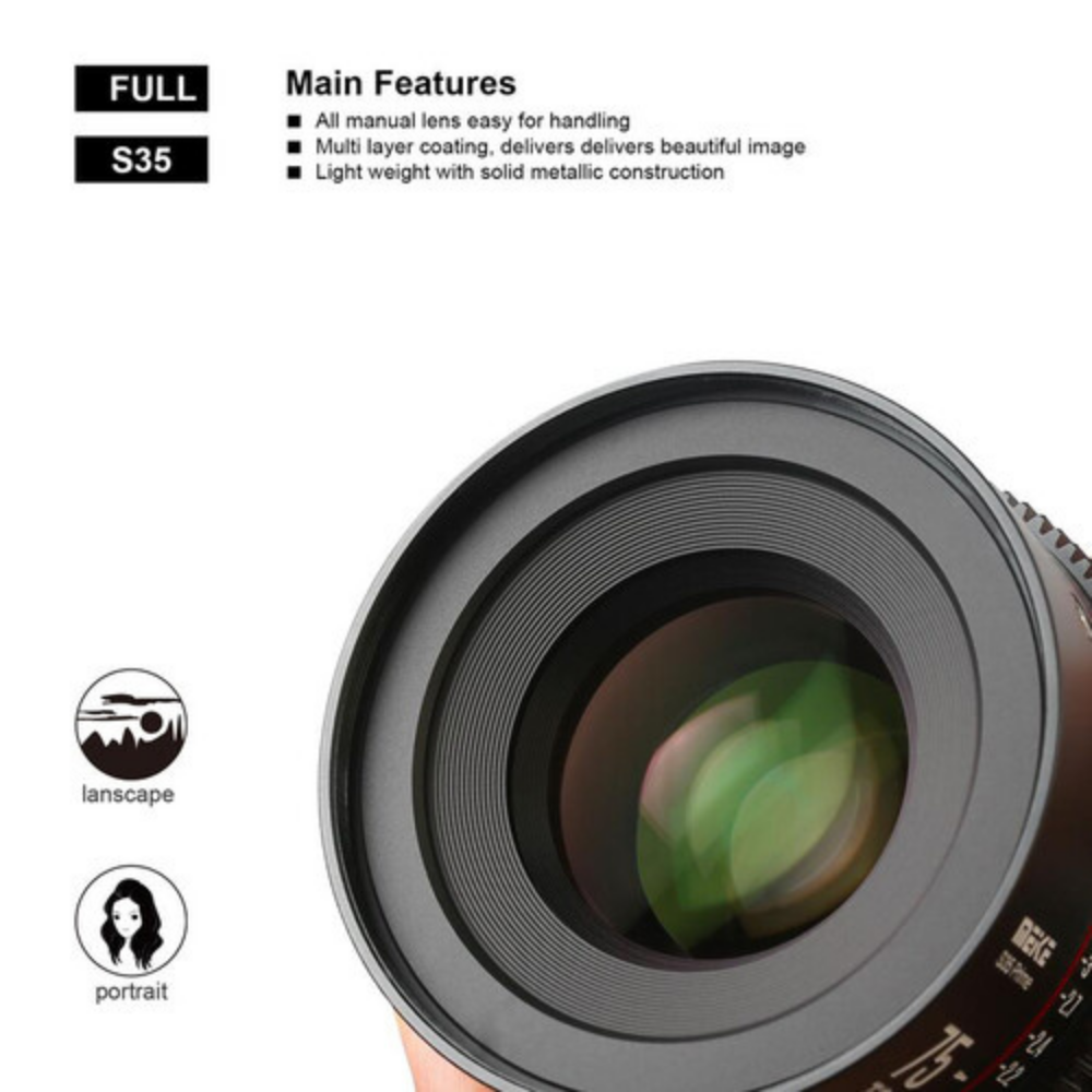 Tercer objetivo cinematográfico de Meike de la serie Super35-Prime Cine Lens: Meike 75 mm T2.1. Este objetivo, con un círculo de imagen de 33,6 mm, es compatible con cámaras Super 35 y estará disponible en dos monturas: PL y EF.Este objetivo es uno de los objetivos cinematográficos de Meike de la nueva serie Super35-Prime Cine Lens. Cuenta con un paso de 0,8 mm en los anillos de enfoque y diafragma.
