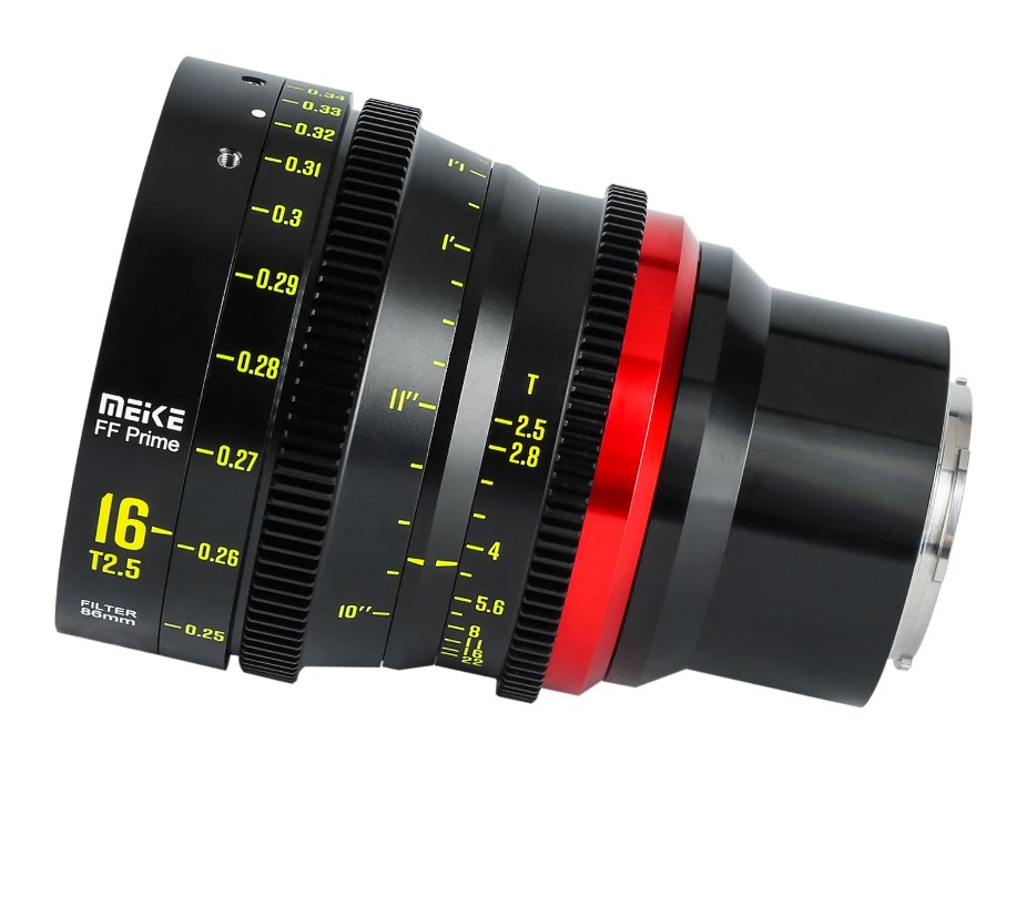 Se trata del sexto objetivo de formato completo para cine de Meike, que se une ahora a la familia de objetivos de formato completo para cine. Cubre un círculo de imagen de 45 mm. Está disponible con monturas PL, Canon EF, Canon RF, Sony E y Panasonic L. El juego completo incluye objetivos de 16 mm T2,5, 24 mm, 35 mm, 50 mm, 85 mm, 105 mm T2,1 y 135 mm T2,4. El objetivo está equipado con graduaciones estándar de 0,8 mm en los anillos de enfoque y diafragma. La construcción del objetivo Meike 16 mm T2,5 FF-Prime consta de dieciséis elementos en once grupos. El mecanismo del diafragma consta de 11 láminas. La distancia mínima de enfoque es de 30 cm.